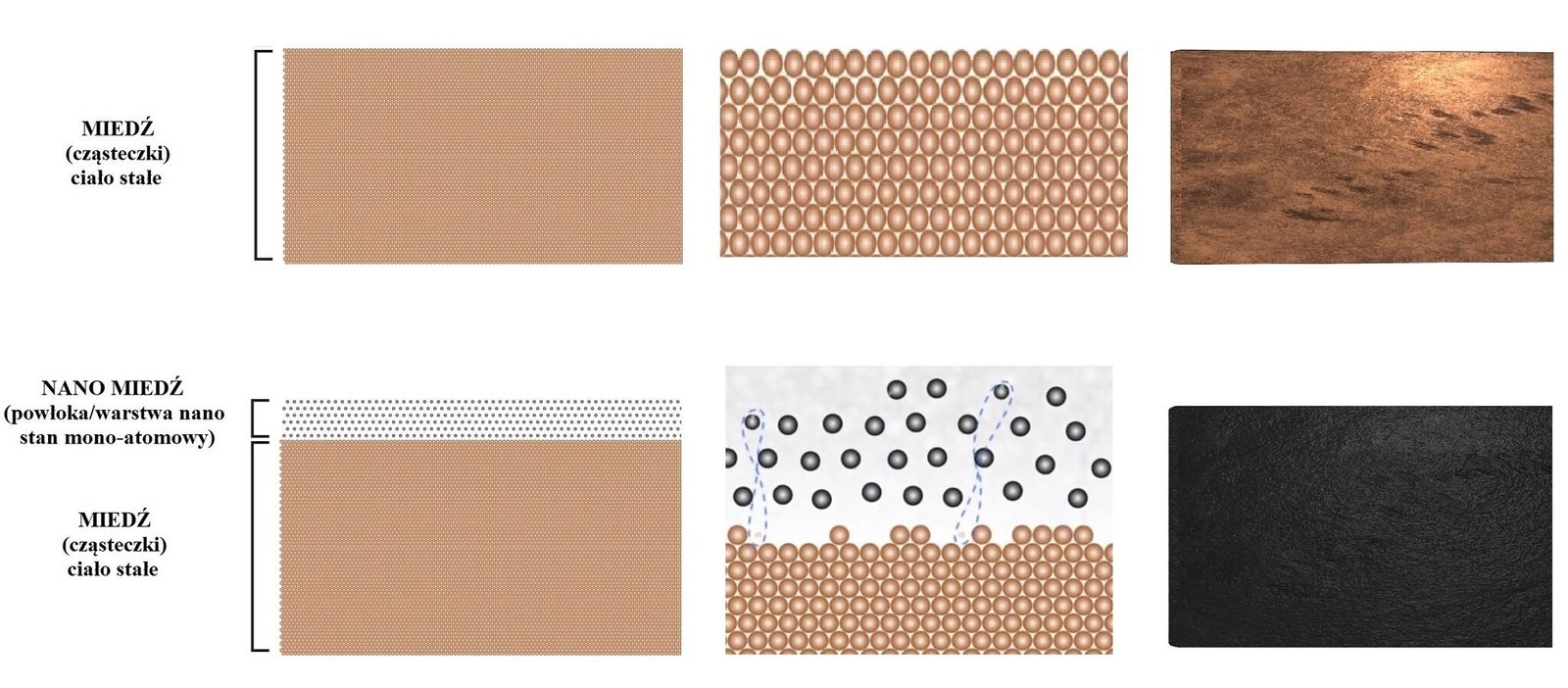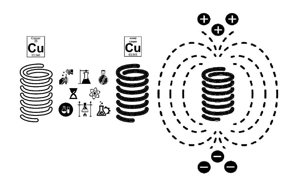 Cząsteczki Nano-miedzi oddziaływują na siebie wzjemnie tworząc w okół siebie przestrzeń, która jest idealnym środowiskiem do przyciągania i przechowywania energii (informacji). W przeciwieństwie do miedzi, gdzie cząsteczki znajdują się ciasno przy sobie.