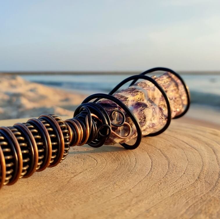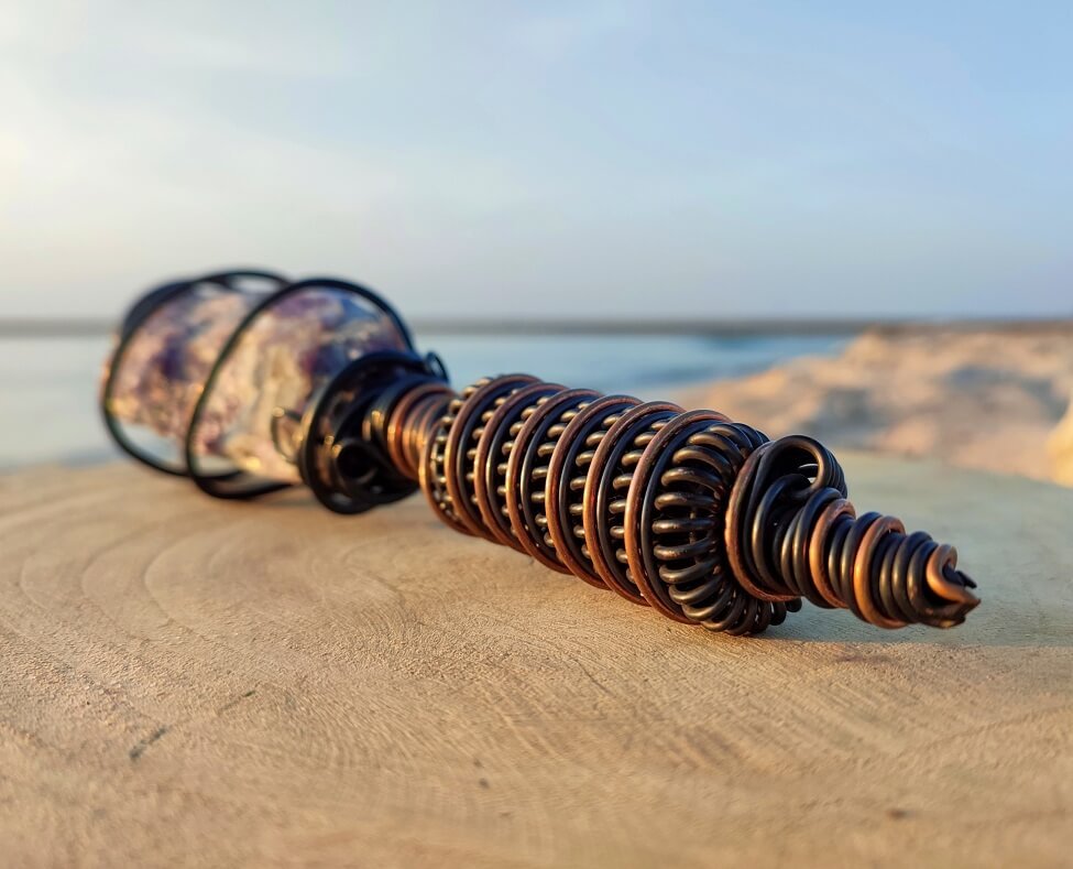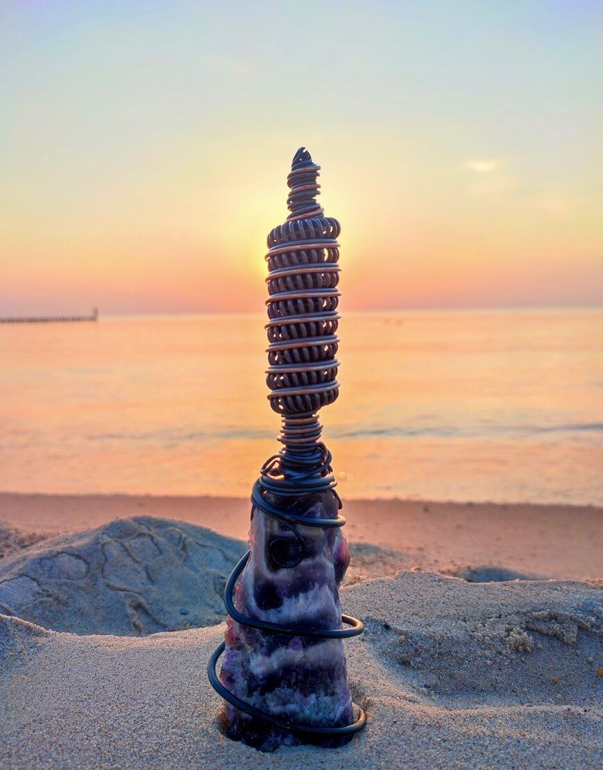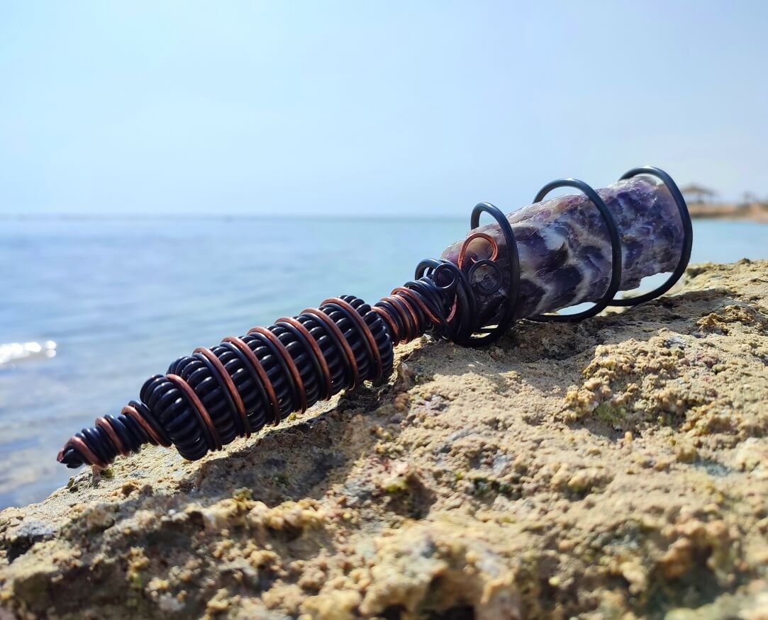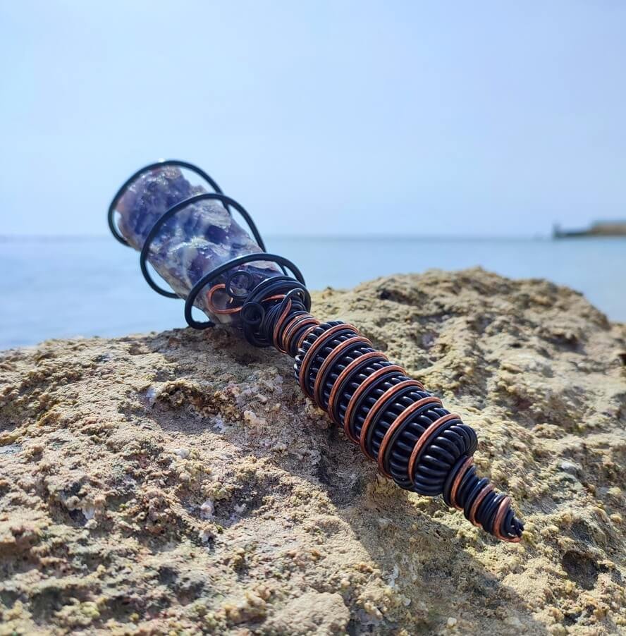 Natural, Raw Amethyst is surrounded by a spiral Tesla coil that which strengthens the effect of the mineral, which translates into an immediate, physically felt, healing effect. Its harmonizing effect works both on the environment and the user, generating a subtle energetic pulse around it.It brings you into a natural state of meditation and relaxation as well as removes the negative impact of electro-smog, wi-fi, electrical devices, in your space.
