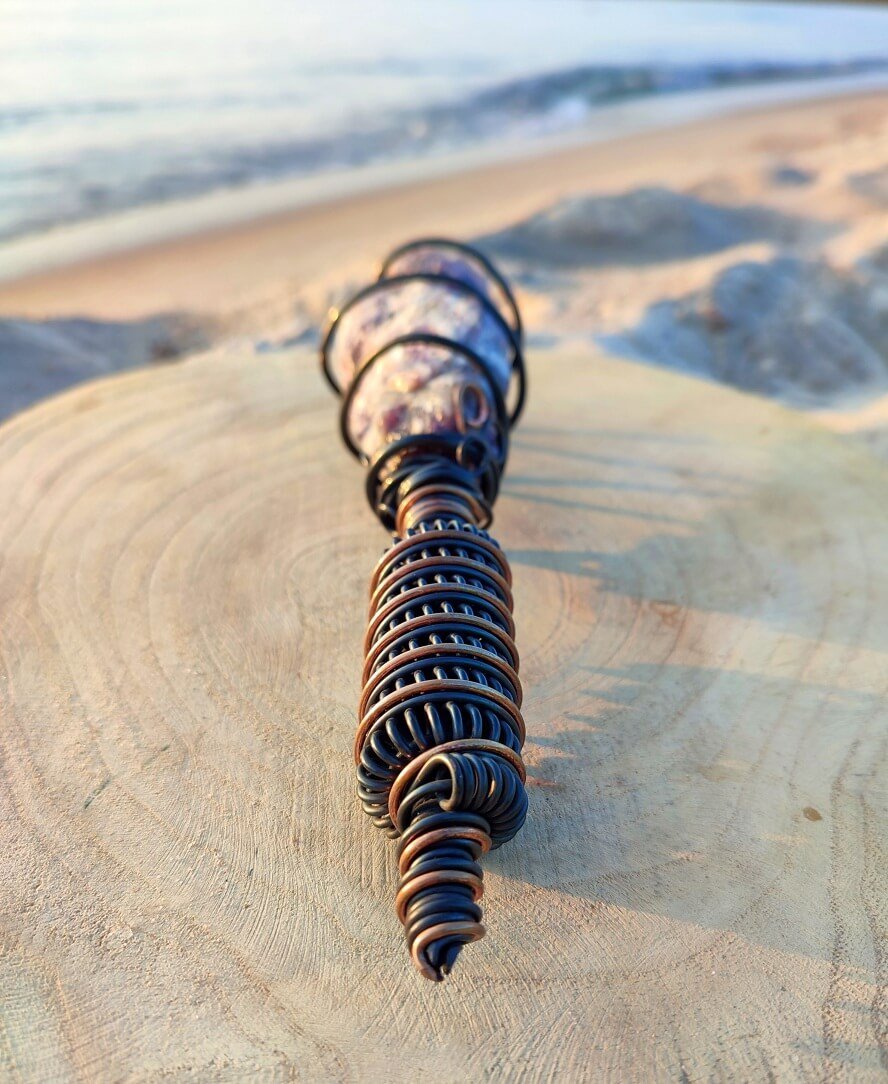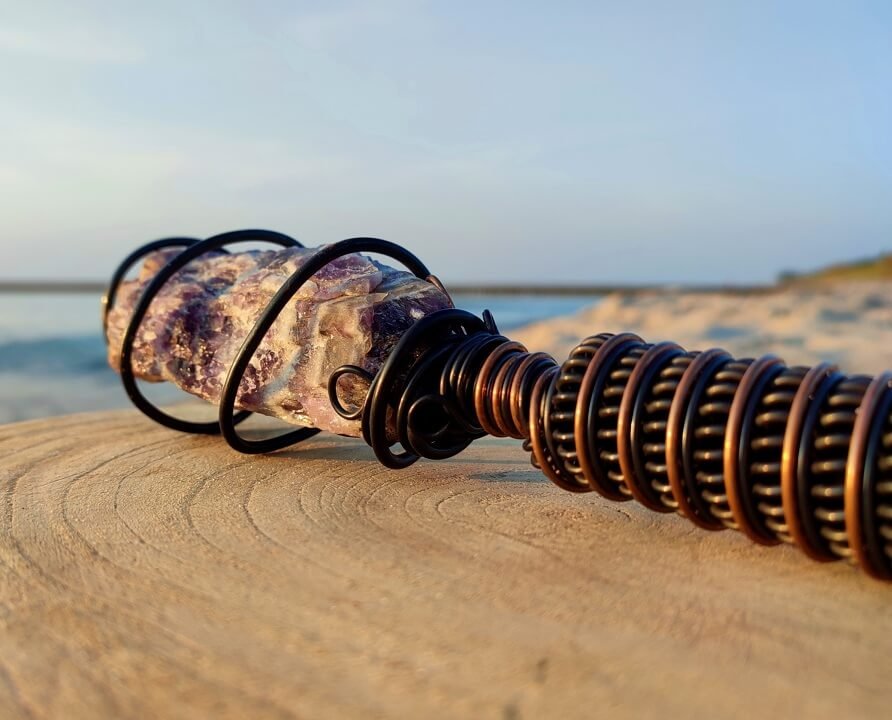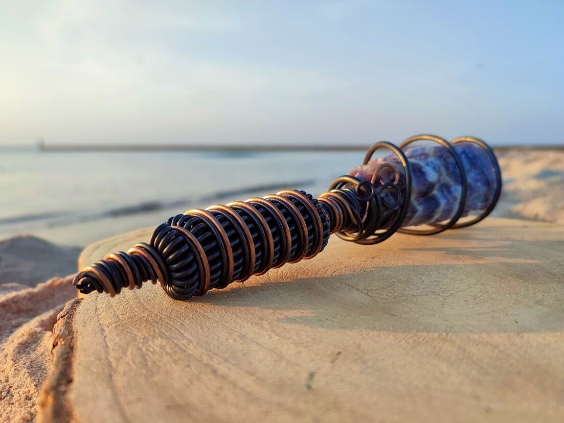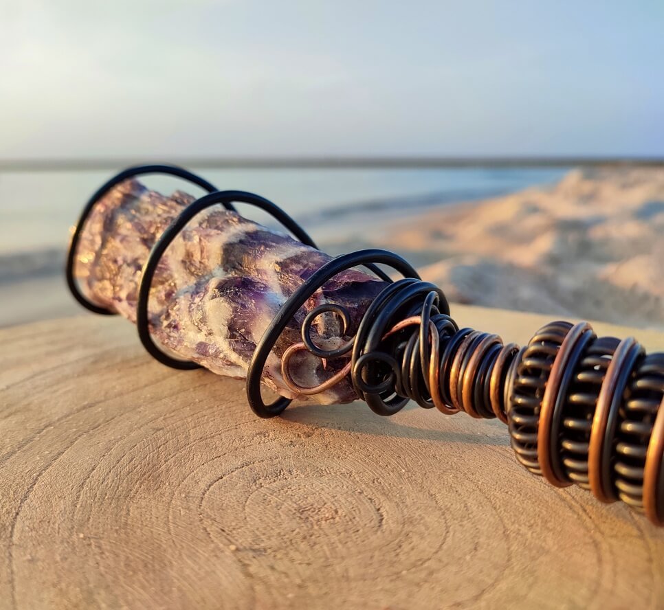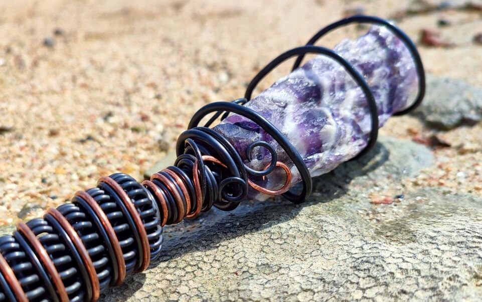Natural, Raw Amethyst is surrounded by a spiral Tesla coil that which strengthens the effect of the mineral, which translates into an immediate, physically felt, healing effect. Its harmonizing effect works both on the environment and the user, generating a subtle energetic pulse around it.It brings you into a natural state of meditation and relaxation as well as removes the negative impact of electro-smog, wi-fi, electrical devices, in your space.
