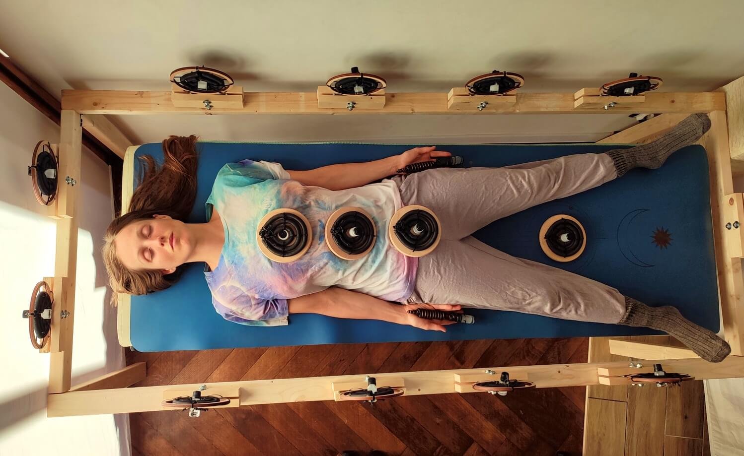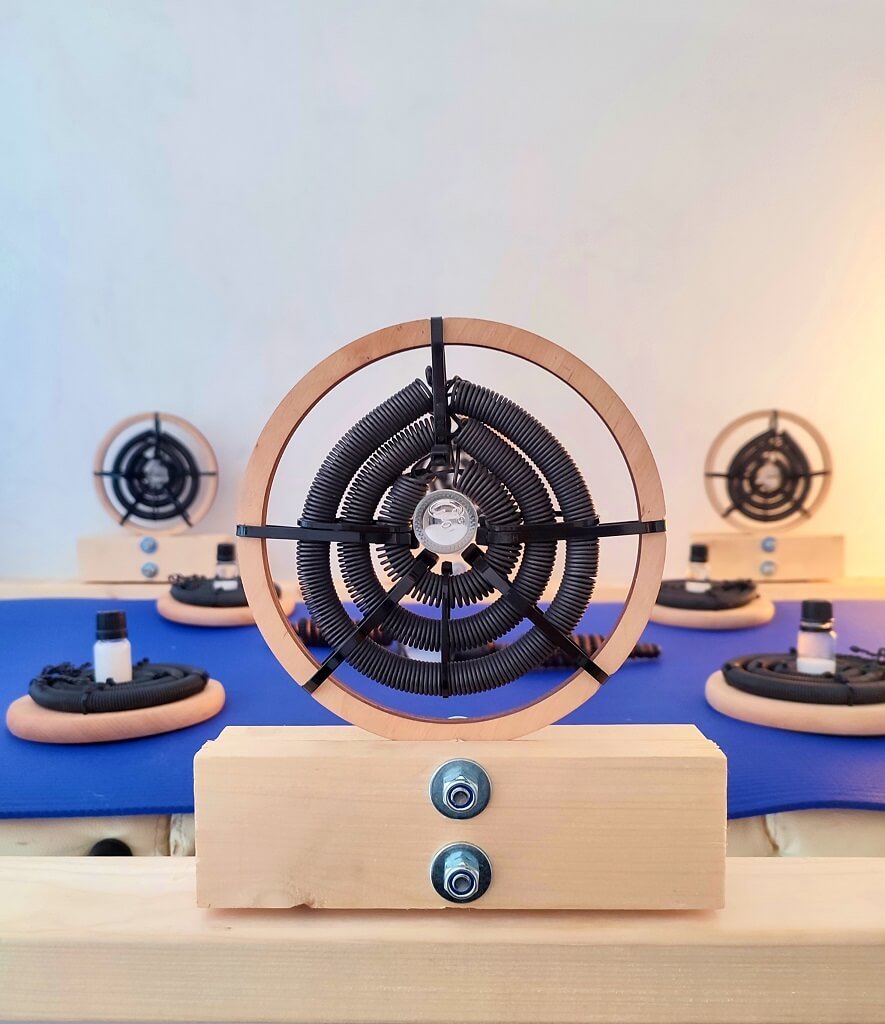 The Bioenergetic Balancing System is built with 11 copper coils coated with a nano-layer, combined with GANS (positioned at the center of the coils) and health-promoting mineral salts. The entire setup is mounted on a wooden frame that can be adjusted to fit a massage table (the Balancing System does not include the massage table).